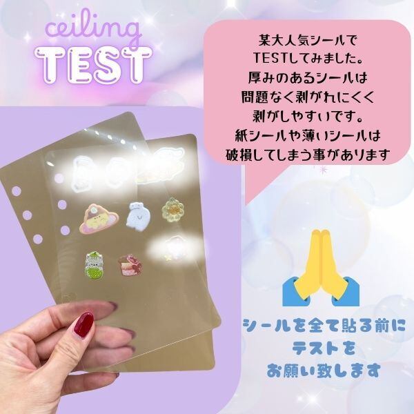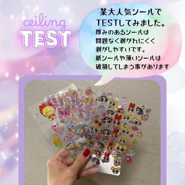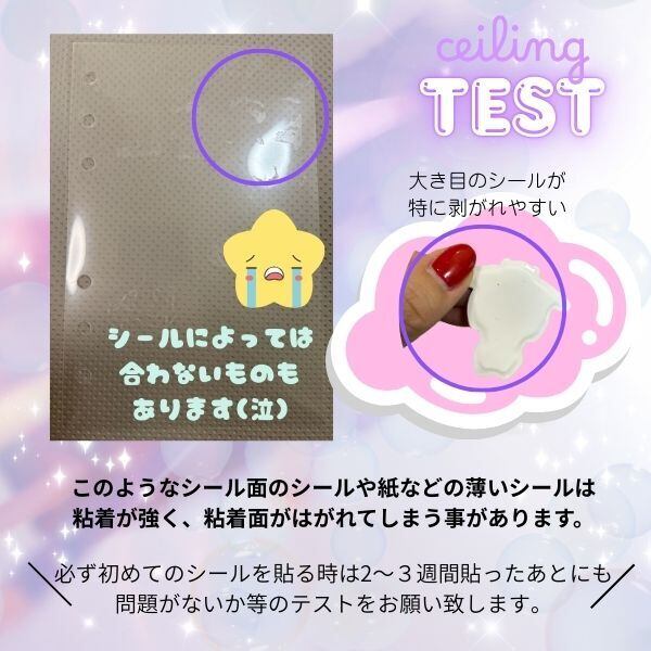 必ず、1〜2枚程度は、シールを貼って問題なく剥がせるかのテストを行っていただき、1週間〜2週間ほど時間をおいても問題なく剥がせるか、お試しをされる事をおすすめいたします。